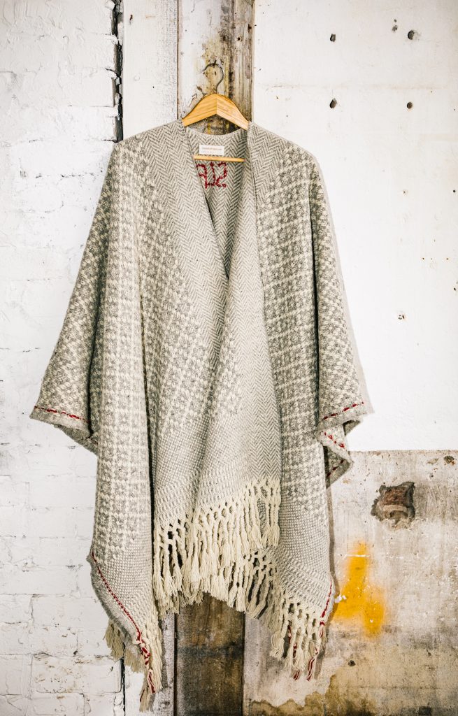 The first Project “ Woven Objects of Desire” started in collaboration with the factory which we visited in the very beginning; together we created 9 Poncho’s and blankets woven on 150 year old machines. The wool which is used comes from regional sheep which are grazing on the plateaus in the National Park Serra da Estrela. All wool is gained, cleaned, spun and woven in the same region. Weaving and finishing the poncho’s is done according to the Zero Waste Principle. The collection of 9 has been inspired by local Portugese patterns which have been woven into blankets for centuries and contemporary denim design and modern art. All handwork has been done in the valley by local families.
